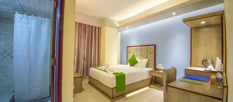 A comfortable room decorated in pastel tones. Standard rooms are equipped with a fully fitted bathroom and shower. Each room is air-conditioned and has a flat-screen TV with international TV channels, cozy king size bed, and a spacious wardrobe.